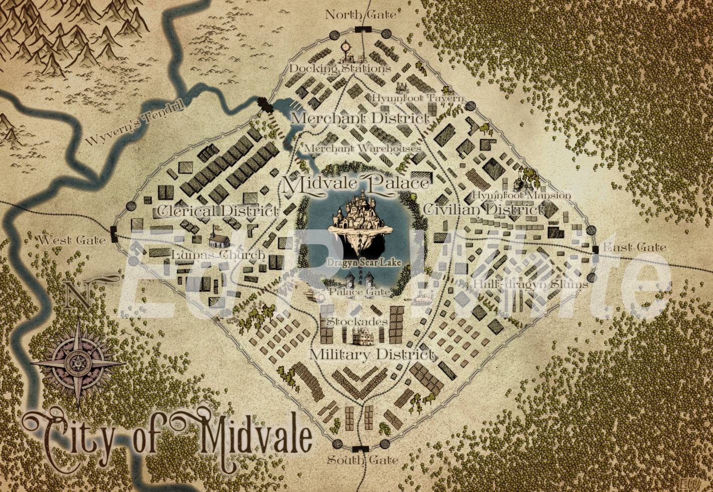 Founded during the Golden Age, Midvale quickly earned its title as the capital of the Fer'tal Crescent. Its strategic location, nestled between vital waterways and airways for trade, offers unparalleled access to the heart of the region. The rugged terrain of Deepwood and the Wyvern's Tendrils provide natural defenses, while the city itself stands as a symbol of power.